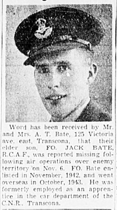 Word has been received by Mr. and Mrs. A. T. Bate, 125 Victoria ave. east, Transcona, that their elder son, F.O. JACK BATE, R.C.A.F., was reported missing following air operations over enemy territory on Nov. 6. F.O. Bate enlisted in November, 1942, and went overseas in October, 1943. He was formerly employed as an apprentice in the car department of the C.N.R., Transcona.